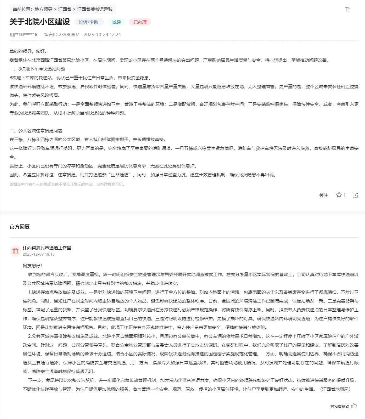 关于反映江西省地质局北院小区快递站管理不善,消防通道被占用的问题。经省地质局核办,已落实专人负责快递站日常管理,开展环境清扫,修复照明设施,增配货架,提升分拣时效。同时,规范管理北院小区搭建的固定棚子,消除安全风险。