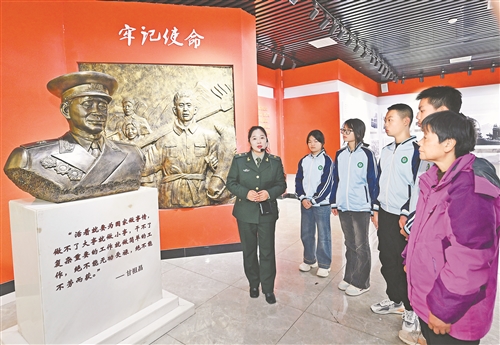甘公荣与孩子们一起在“不忘初心”事迹陈列馆听甘祖昌的故事。记者 吴文兵摄