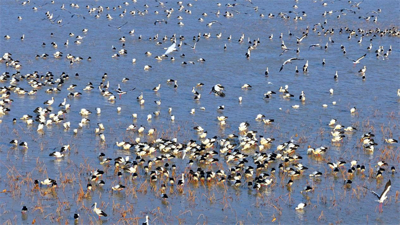千余只东方白鹳在鄱阳湖中栖息觅食,场面壮观。 王小龙摄