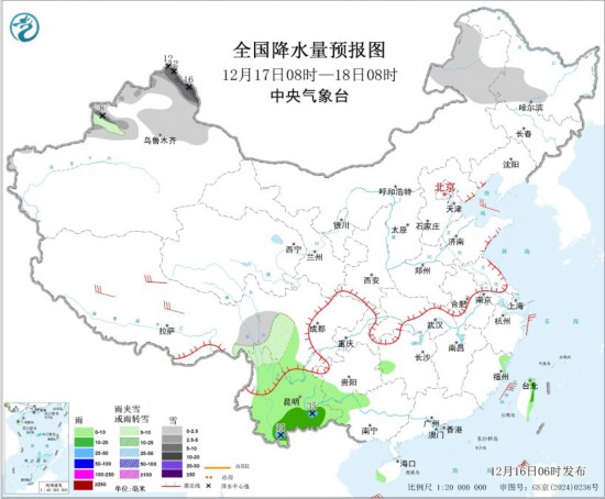 12月17日08时至18日08时,内蒙古东北部、黑龙江西南部、新疆北部、川西高原南部等地部分地区有小到中雪或雨夹雪,其中,新疆阿勒泰地区和伊犁河谷局地有大到暴雪(10~16毫米)。西南地区南部、湖南西部、福建东北部、广西西北部、海南岛西南部等地部分地区有小到中雨,其中,云南东南部局地有大雨(25~35毫米)。西藏中北部等地部分地区有4~6级风;东海南部海域、台湾海峡、巴士海峡、南海东北部和中东部海域将有5~7级大风、阵风8级。