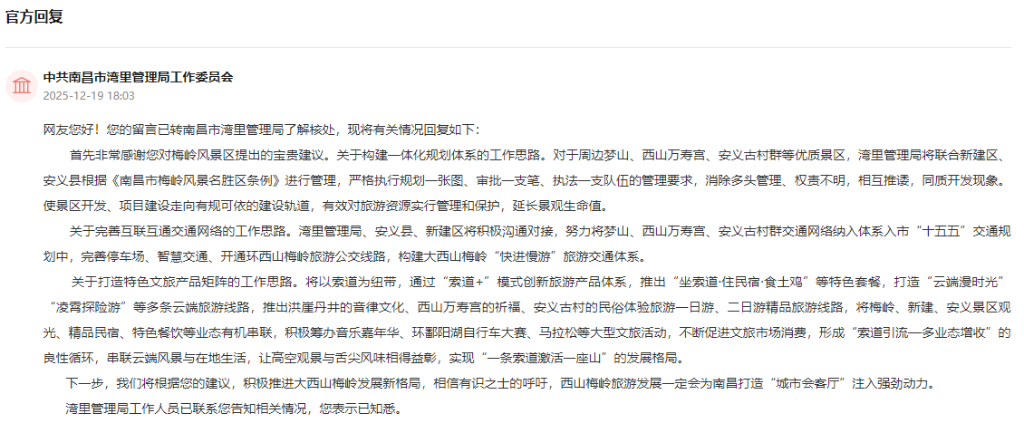 收到网友留言后,南昌市湾里管理局进行了回复。关于构建一体化规划体系的工作思路。对于周边梦山、西山万寿宫、安义古村群等优质景区,湾里管理局将联合新建区、安义县根据《南昌市梅岭风景名胜区条例》进行管理,严格执行规划一张图、审批一支笔、执法一支队伍的管理要求,消除多头管理、权责不明,相互推诿,同质开发现象。使景区开发、项目建设走向有规可依的建设轨道,有效对旅游资源实行管理和保护,延长景观生命值。