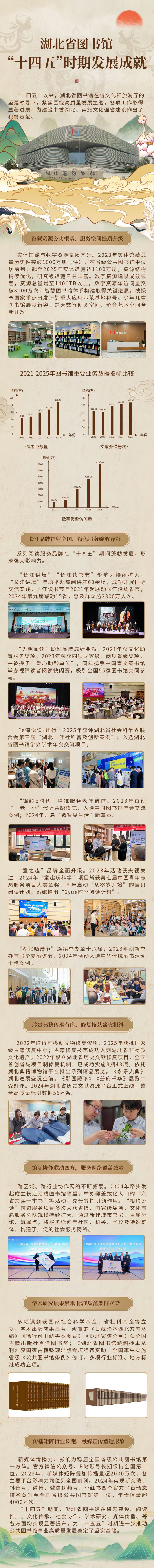 “十四五”期间,湖北省图书馆以书香为笔、以创新为墨,绘就了一幅资源丰盈、服务暖人、传承有力、协作共进的文化画卷。从馆藏突破千万册到古籍修复入选非遗,从“长江讲坛”辐射全国到新媒体传播领跑行业,省图以实实在在的成果,为“文化强省”写下生动注脚。这张长图,带您一览五载耕耘的璀璨华章。