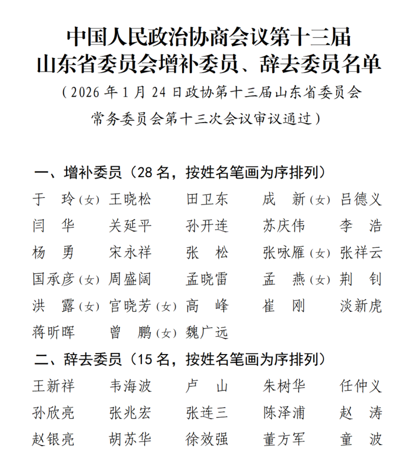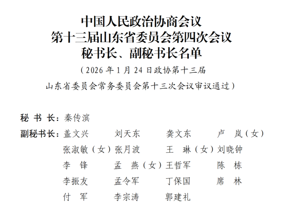 1月24日,中国人民政治协商会议第十三届山东省委员会常务委员会第十三次会议决定:政协第十三届山东省委员会第四次会议于2026年1月26日在济南召开。