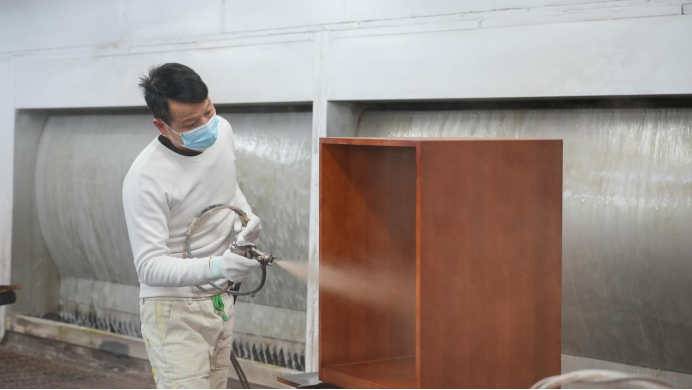 江西团团圆家具有限公司喷涂车间,油漆工正在喷涂水性涂料。南康区融媒体中心供图