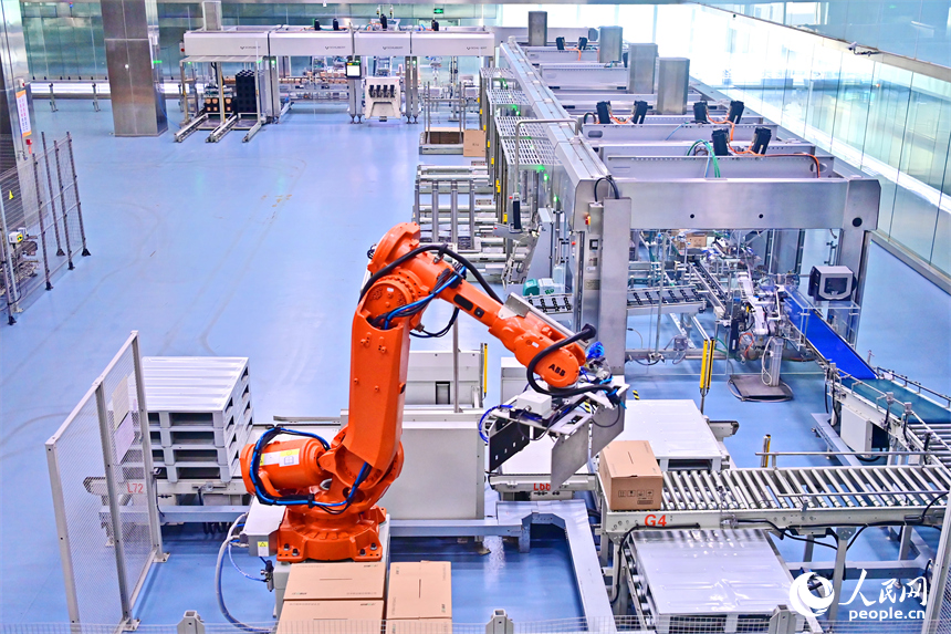 在江中药谷车间内,智能设备来回转动,产品运输包装有序进行。人民网记者朱海鹏摄