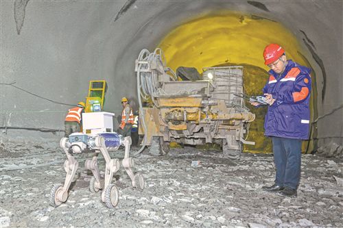 2月5日,工作人员利用轮足式机器狗在长赣高铁井冈山隧道施工现场进行巡检。记者 洪子波摄