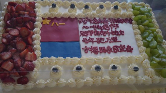 2月16日,在空军航空兵某旅驻训分队,炊事班官兵为年夜饭准备了蛋糕。新华社记者 张瑞杰 摄