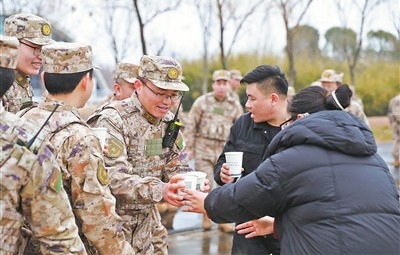 1月4日,安徽省合肥警备区组织新年度军事训练动员,并开展多课目训练。下午,官兵们结束训练途经合肥市包河区,街道工作人员在道路沿途设置休息驿站,为官兵送上茶水。(赵业统 文/图)