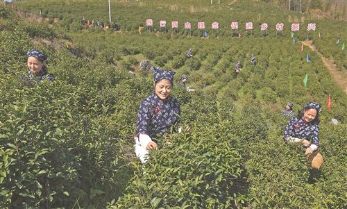 随着天气转暖,铅山县河红茶长势喜人。该县河红茶种植面积11.4万亩,年产量4520吨,综合产值24亿元,带动4.8万人从业,人均年增收2.5万元。图为3月13日,铅山县葛仙山镇朱村村千亩生态示范茶园内,茶农正在采摘春茶。 (记者 刘宇琦摄)