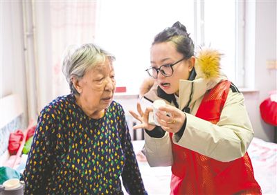 社区工作人员上门为孤寡老人讲解用药说明。记者 郑学良 摄