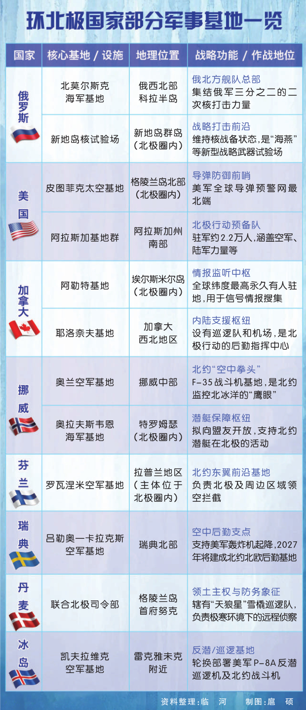 俄罗斯在北极拥有显著地缘优势。自2005年起,俄罗斯重启并升级数十个苏联时期军事基地,在其北极圈内地区及近海岛屿构建纵深防御网。
