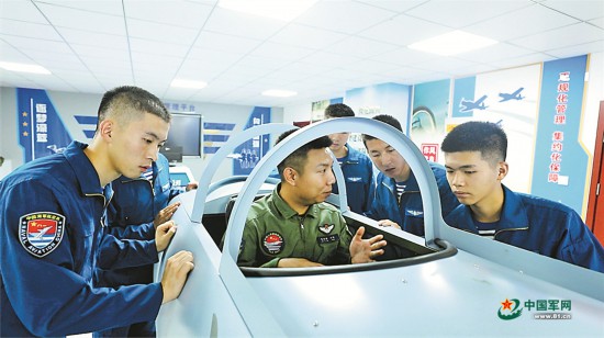 海军航空大学飞行教官对学员进行模拟机训练指导。李彦霖摄