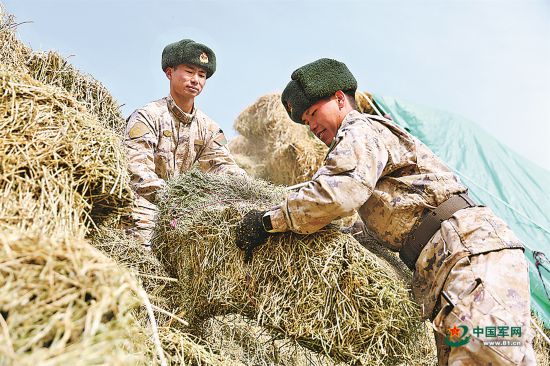 官兵合力搬运牧草。