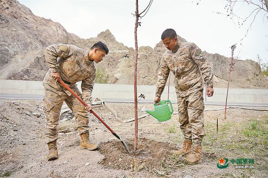战士在哨所旁种树。