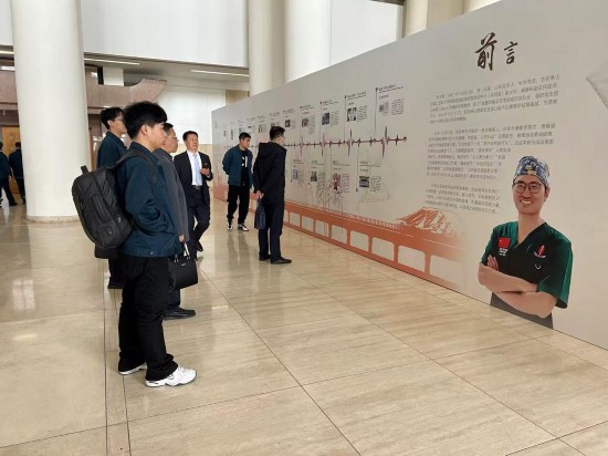 报告会开始前,许多观众驻足在“医心化桥 英雄无悔”——齐鲁时代楷模张军桥同志的21个瞬间事迹展前,认真阅读,缅怀英雄。
