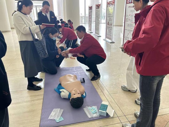 “遇到有人晕倒,轻拍双肩呼唤,检查意识和呼吸……”“胸外按压要有力,每分钟约120次……”会场外,来自山东第二医科大学“军桥心跳行动”的志愿者们现场演示急救流程。许多观众认真学习、上手演练,并按照志愿者提示打开小程序,搜索附近的AED急救设备。