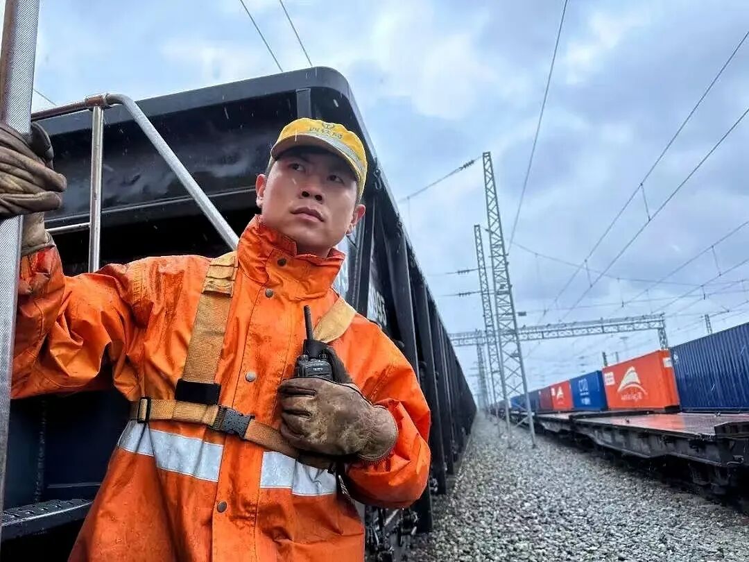 第一个任务是为发往阿塞拜疆巴库的中欧班列编组。站在调车机侧面,我盯着车厢与机车的钩连处,大声喊出“连结”指令。之后,机车司机制动精准,车厢慢慢靠近,“哐当”一声,车钩稳稳锁闭。我快步上前,检查钩舌、风管连接情况,指尖划过车钩,逐一确认。
