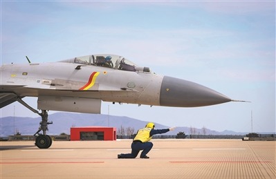 前不久,海军航空大学某大队开展舰载机陆基起降训练。图为起飞助理放飞舰载机。 孙宏强摄