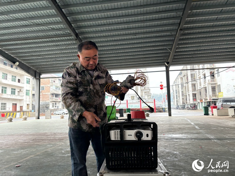 胡克丰为电影放映做准备工作。人民网记者 邹玢琦摄