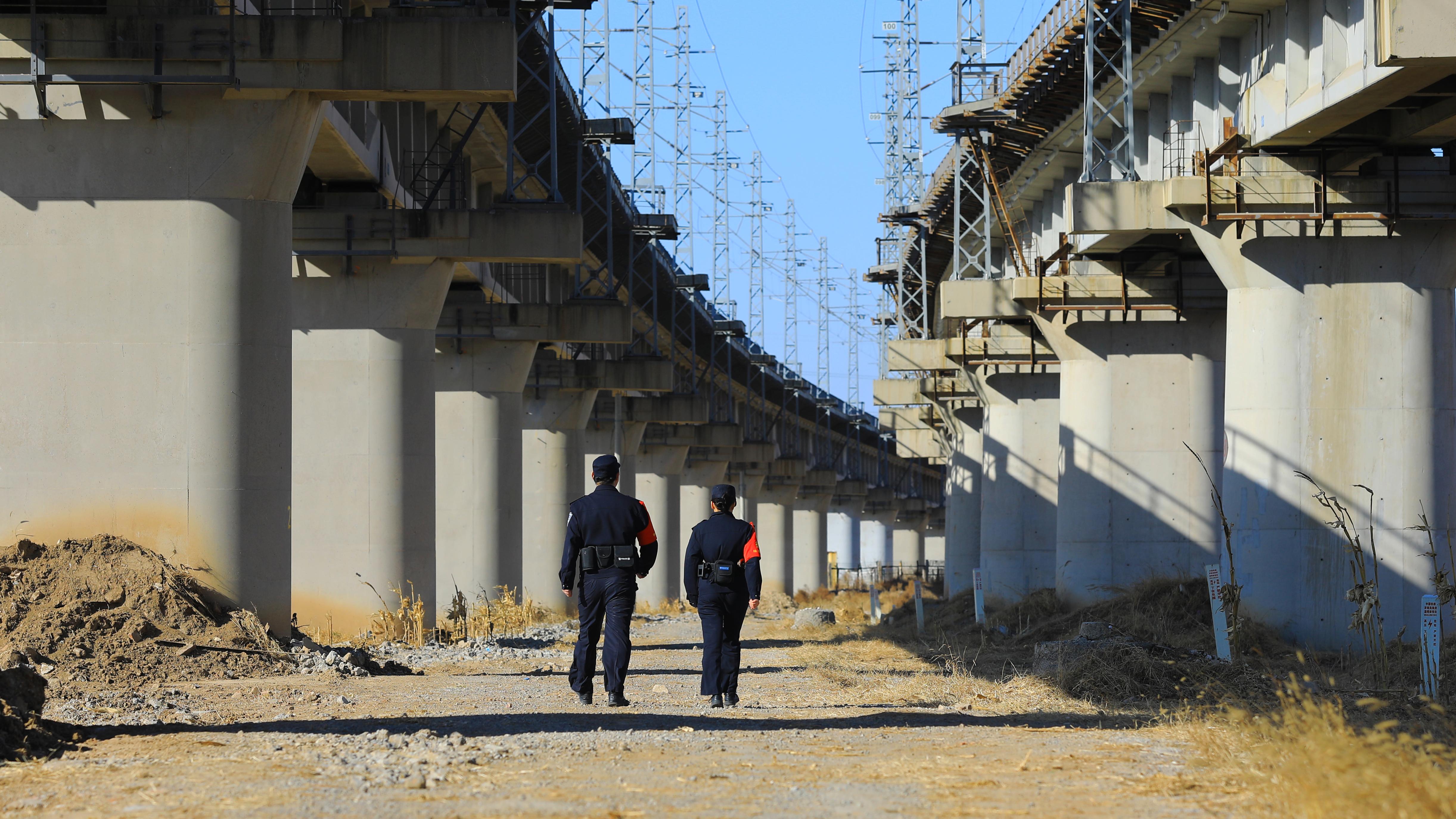 铁警正在铁路沿线巡线。