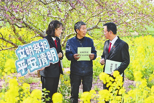 活动中,干警们走进田间地头、乡村集市,与群众面对面沟通交流,结合相关法律法规和典型案例,耐心讲解违规焚烧、野外用火等行为可能承担的法律后果。同时还向群众发放了《文明祭祀倡议书》,倡导采用鲜花祭祀、网络追思等方式寄托哀思,营造文明节俭、安全祥和的清明氛围。图为该院干警为群众讲解文明祭祀相关宣传资料。(黄宪伟 摄)