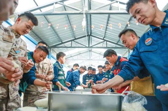 2月16日,空军航空兵某旅驻训分队组织官兵包饺子。蓝善湖摄