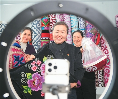 3月11日,在新疆维吾尔自治区沙湾市博尔通古乡阔克加依达克社区的海霞刺绣合作社里,合作社成员正在通过网络直播销售哈萨克族刺绣手工艺品。 |